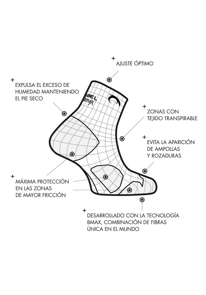 Este modelo de calcetín ha sido elaborado con la tecnología Bmax, mantiene los pies en perfectas condiciones evitando las ampollas y las rozaduras causadas por: