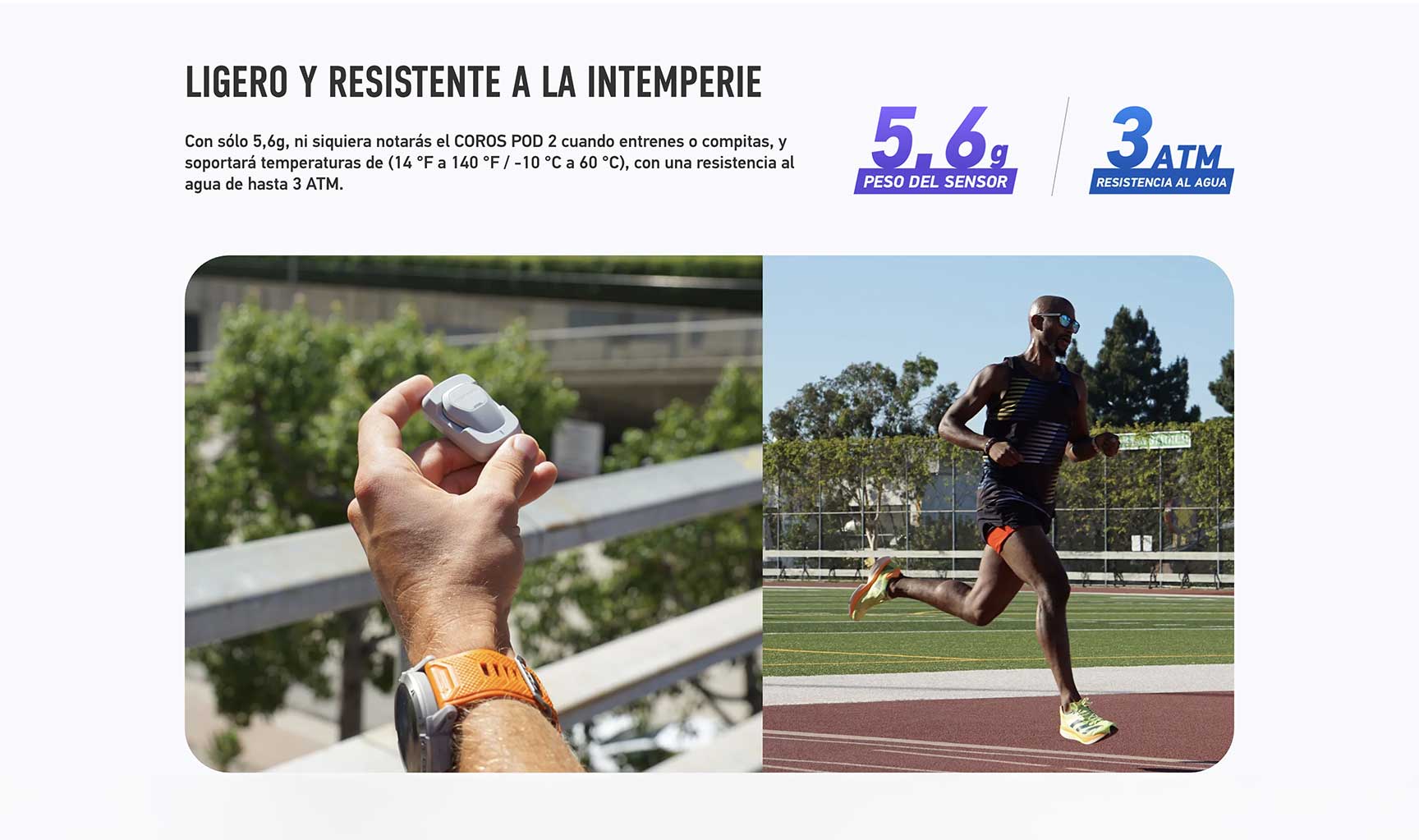 El COROS POD 2 es un sensor ligero y resistente al agua que proporciona datos de carrera de otro nivel directamente a partir de los movimientos de tu pie o cuerpo. Se conecta a tu reloj COROS para proporcionar métricas en tiempo real, información posterior a la carrera y análisis de la forma de correr, para que dispongas de la mejor información durante y después de la carrera.