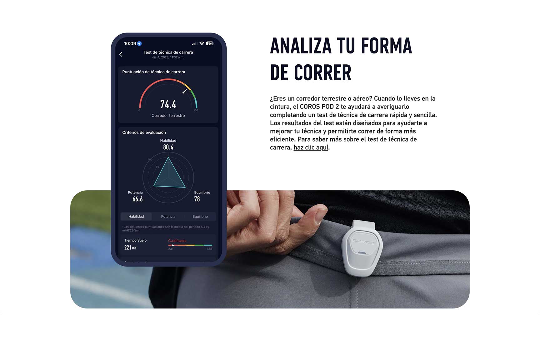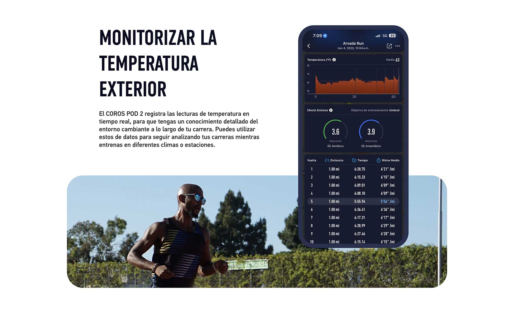 • Métricas de carrera avanzadas: temperatura ambiente, tiempo en el suelo, equilibrio L/R, altura de zancada, relación de zancada