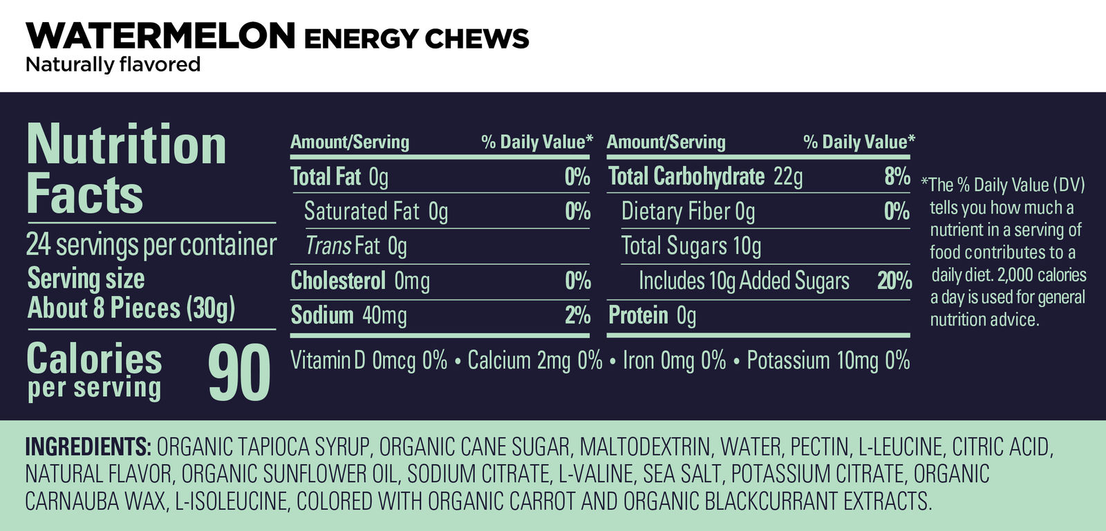 Creados para el entrenamiento diario y competencias, GU Energy Chews Watermelon contiene energía y calorías en una presentación que puedes llevar contigo para ayudarte a mantener la demanda de energía en actividades de larga duración. La presentación de 90 calorías contiene carbohidratos para mantenerte con «combustible»mientras retarda una baja repentina en tu desempeño («pajara» o Bonk), manteniendo de repuesto tus reservas de glucógeno. El sodio que es el primer tipo de electrolito que se pierde al sudar, esta contenido en Chews para mantener en balance tu hidratación. La cadena de aminoácidos que contienen los Chews (Leucina, Valina, isoleucina) te ayudan a reducir la fatiga mental y a disminuir el desgaste muscular. Los ELECTROLITOS mantienen el balance en la hidratación. Los CARBOHIDRATOS te proporcionan energía inmediata para que dispongas de ella y retrasan una baja repentina de energía (pájara, Bonk), manteniendo reservas de glucógeno. Los AMINOACIDOS reducen la fatiga mental y disminuyen el desgaste muscular. La CAFEINA mejora tu desempeño aumentando la concentración y disminuyendo el desgaste mental. consume una porcion (4 chews) 15 min antes de iniciar y subsecuentemente una porcion cada 45 min de actividad. Tómalo con tu bebida hidratante favorita de los productos GU ò agua para mejor absorción.