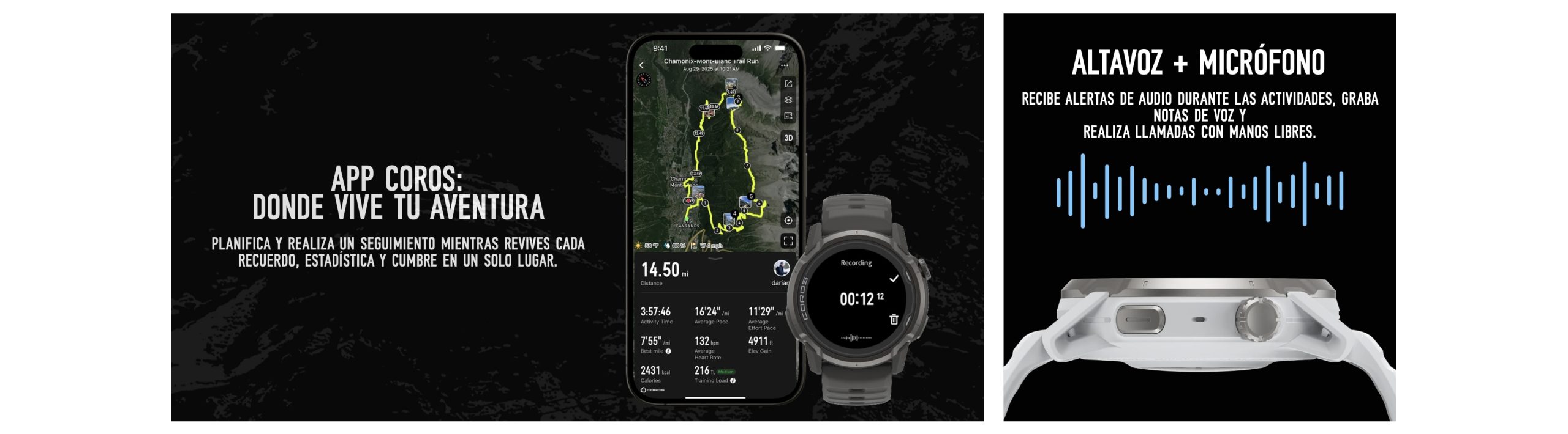 El APEX 4 también incluye mapas globales multicapas con navegación giro-a-giro, métricas avanzadas de rendimiento y recuperación, un micrófono y altavoz integrados para alertas de ritmo y llamadas manos libres, así como métricas completas de salud (frecuencia cardíaca, VFC, sueño, estrés). Todo esto lo convierte en una herramienta esencial para planificar, medir y superar tus marcas personales en cualquier terreno.
